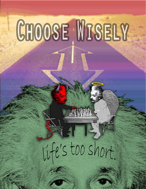 Here is a piece that I created while attending Westwood College for one of my classes. We had to come up with a theme and illustrate it. My theme was "making choices" and I chose to use Albert Einstein as part of my illustration. I used Photoshop for this one and think it came out well. I narrowed it down to good vs. bad choices which is the reason for the double sided arrow on the road and why I chose to use the good conscience vs bad conscience characters.